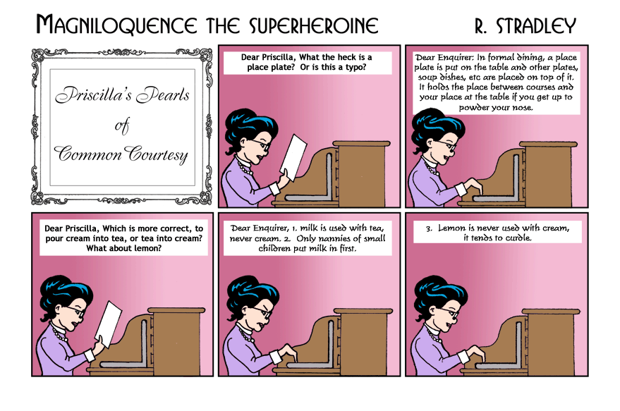 Priscilla expounds on placeplates and tea . -- Robert Stradley, the Weekend Artist. |