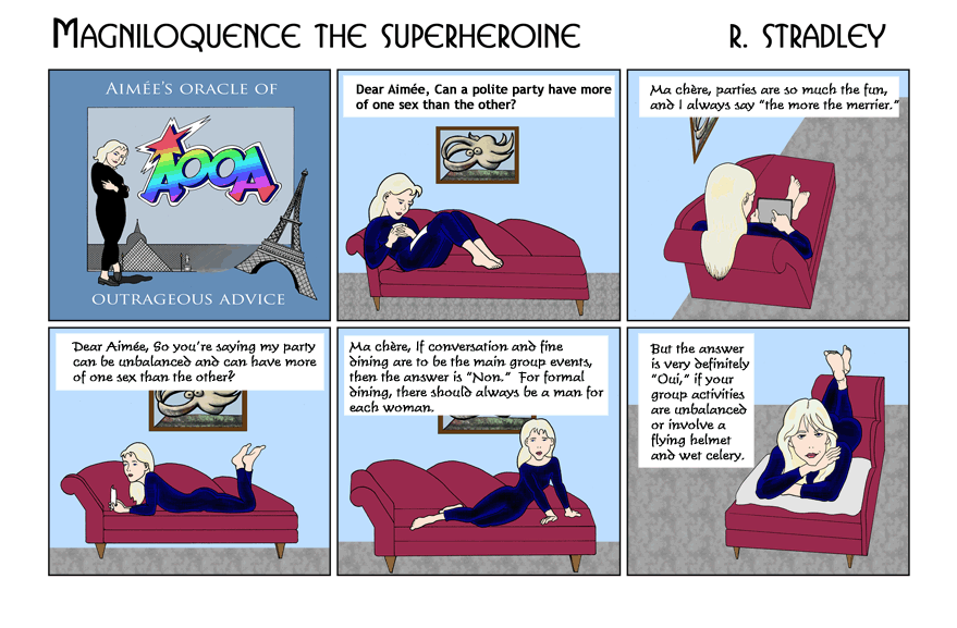 Amiee's Oracle of Outrageous Advice begins with party advice using a flying helmet and wet celery. Reference anyone? -- Robert Stradley, the Weekend Artist. |