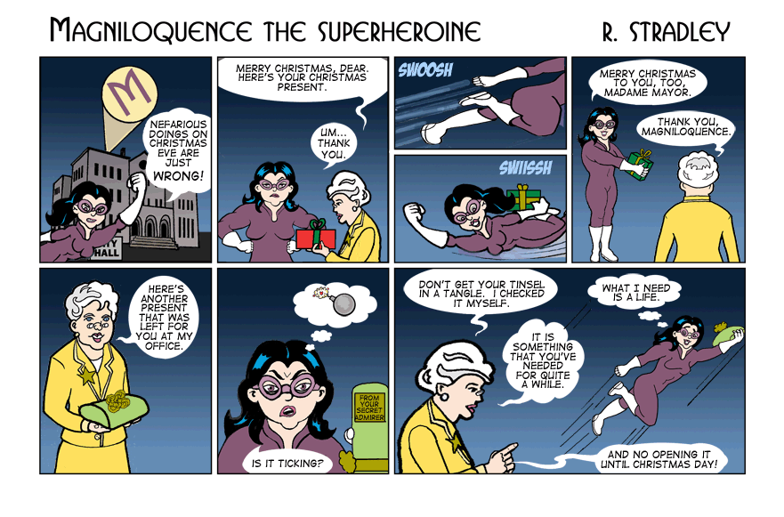 Christmas Eve deliveries and doings. The real question is: is Magniloquence's secret admirer a good guy or a bad guy? -- Robert Stradley, the Weekend Artist. |