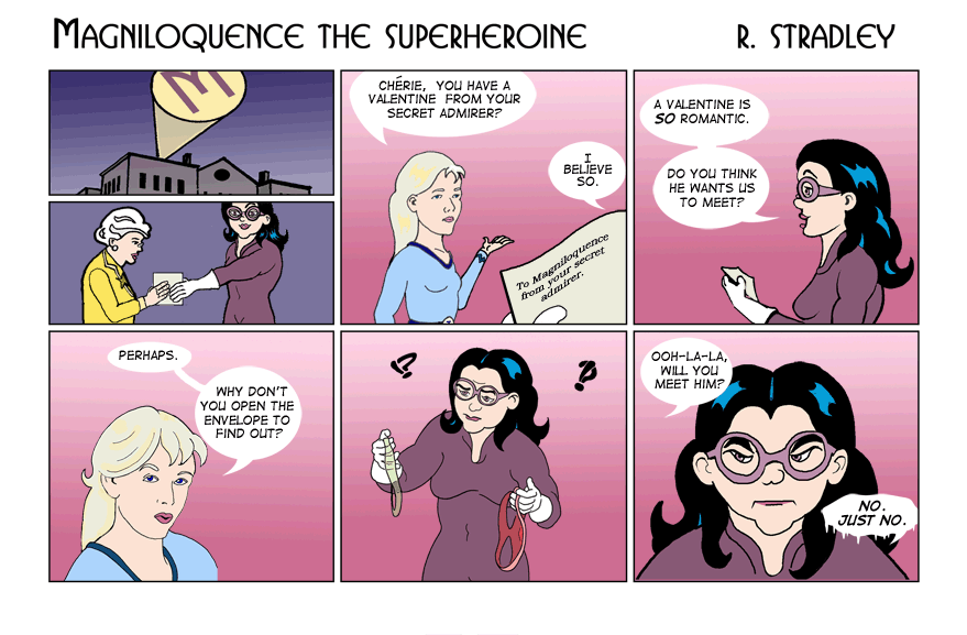 Magniloquence gets a Valentine from her secret admirer. However, since she is a virtuous unmarried lady, she thinks it is disgusting, not romantic. Having been in this situation a few times myself, I understand the problem. Romance and sex, while interrelated, are Not The Same. -- Robert Stradley, the Weekend Artist. |