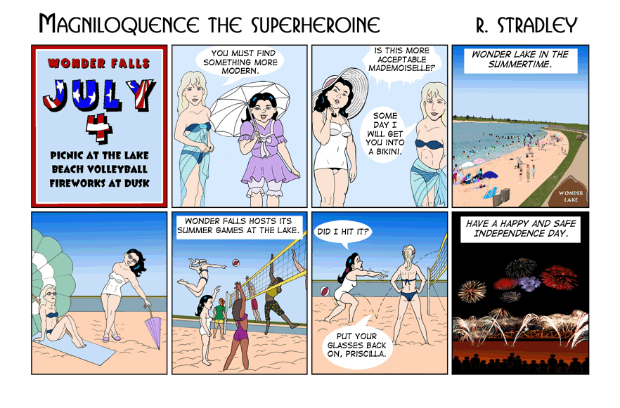 Yeah for holidays! I have officially declared that 4th of July holiday panel is the swimsuit issue. Priscilla's two suits are from an early 1900's Atlantic City, NJ photo and from a 1950's swimsuit advertisment. Aimée's ensemble is from a 2016 summer catalog. In her personna of Priscilla Hawthorne, Magniloquence plays sports badly, especially when she doesn't wear her glasses. -- Robert Stradley, the Weekend Artist. |