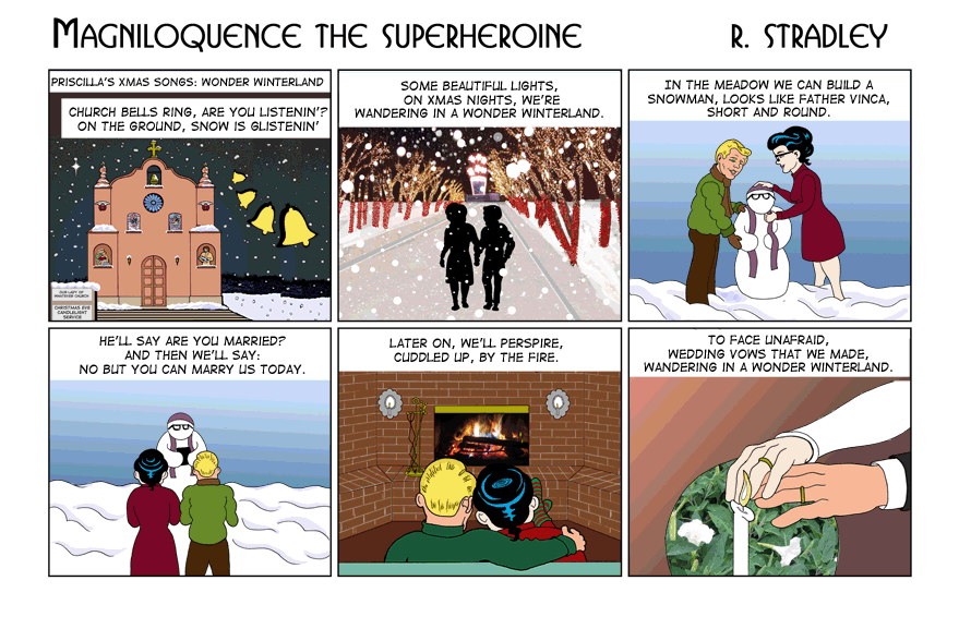 . As a companion piece to last week's Chrismas song [where she sang about getting married] Wonder Winterland is the logical extension in Wonder Falls. For Priscilla, secular Chrismas songs are about doing right and having good clean fun at this most joyous time of the year.. -- Robert Stradley, the Weekend Artist. |