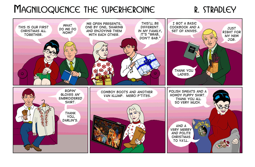 © 2013-2020. Magniloquence TM the Superheroine is written and illustrated by Robert Stradley, Characters and elements of Magniloquence are TM and © 2013-2020 Robert Stradley. All rights reserved. Graphic novels are published by Twisted Tail Productions PO box 9778 Wichita Falls, Texas, USA 76308. All names, characters, places, and events are fictitious and are meant to be treated as such. Any resemblance to actual persons past, present, or future is entirely coincidental. Any tongue-in-cheek reference to existing comics is purely intentional and readers are encouraged to ferret them out. If you cannot find any, you need to read more comics. If you can read this, you probably don't need new glasses.