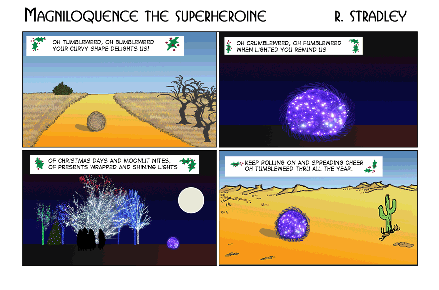 © 2013-2020. Magniloquence TM the Superheroine is written and illustrated by Robert Stradley, Characters and elements of Magniloquence are TM and © 2013-2020 Robert Stradley. All rights reserved. Graphic novels are published by Twisted Tail Productions PO box 9778 Wichita Falls, Texas, USA 76308. All names, characters, places, and events are fictitious and are meant to be treated as such. Any resemblance to actual persons past, present, or future is entirely coincidental. Any tongue-in-cheek reference to existing comics is purely intentional and readers are encouraged to ferret them out. If you cannot find any, you need to read more comics. If you can read this, you probably don't need new glasses.