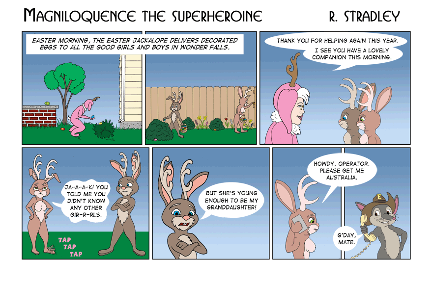The Mayor meets Jak the Easter Jackalope and his companion, Jill. JIll gets jealous over "Jak's new girl" and calls Australia for a new boyfriend, the Easter Bilby. -- Robert Stradley, the Weekend Artist. |