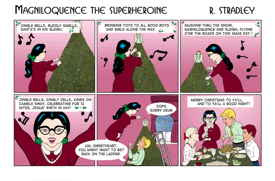 © 2013-2020. Magniloquence TM the Superheroine is written and illustrated by Robert Stradley, Characters and elements of Magniloquence are TM and © 2013-2020 Robert Stradley. All rights reserved. Graphic novels are published by Twisted Tail Productions PO box 9778 Wichita Falls, Texas, USA 76308. All names, characters, places, and events are fictitious and are meant to be treated as such. Any resemblance to actual persons past, present, or future is entirely coincidental. Any tongue-in-cheek reference to existing comics is purely intentional and readers are encouraged to ferret them out. If you cannot find any, you need to read more comics. If you can read this, you probably don't need new glasses.