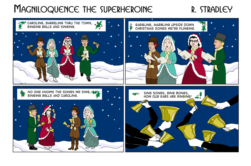 Janusc, Aimée, and Billy Bob join Priscilla in her off center christmas carols in Priscilla's version of Caroling, Caroling, Thru the town. . -- Robert Stradley, the Weekend Artist. |