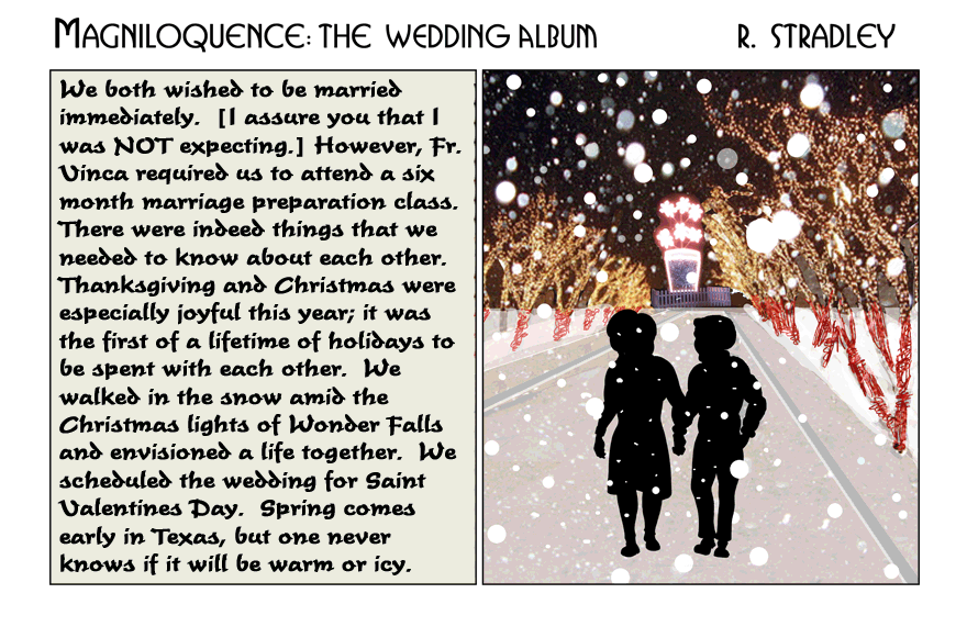 Wedding is delayed for 6 months for the church-required marriage preparation class. Priscilla is bound by her lawfully good nature to obey. -- Robert Stradley, the Weekend Artist. |