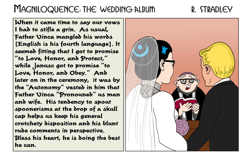 Once again, I got to play with spoonerisms and Fr. Vinca. AlsoI got to play with tropes as Janusc vows to Love Honor and Obey. . -- Robert Stradley, the Weekend Artist. |