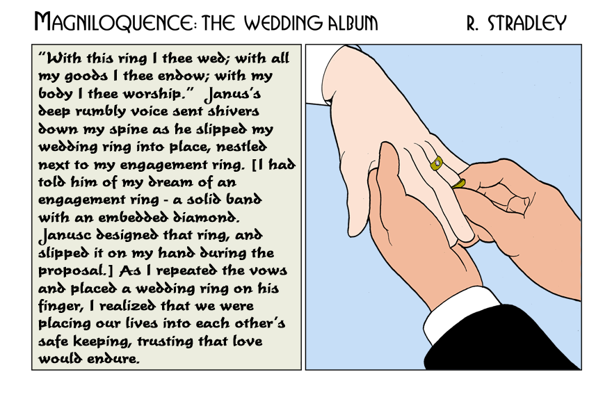 This panel is autobiographical. The engagement dream was my wife's and the ring on my wonderful wife's hand. So was the photo from which this picture was drawn. -- Robert Stradley, the Weekend Artist. |