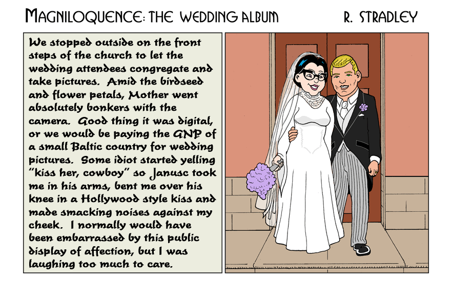 Priscilla, as a doyen of propriety, is obviously against PDA's. However, much can be forgiven a new bride at her wedding and reception, especially when she is giggling over it. -- Robert Stradley, the Weekend Artist. |
