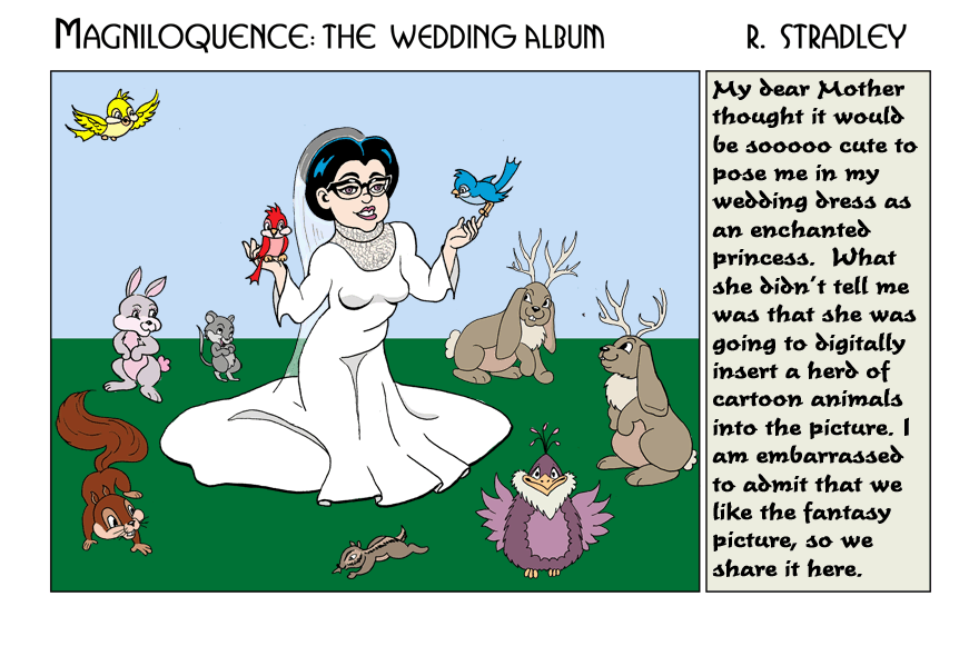 The Enchanted Princess fairy tale photo is one of the interesting variations popping up on-line. Priscilla is too well grounded to believe in a fairy tale wedding, but she and Janusc can find the whimsy in such a picture. -- Robert Stradley, the Weekend Artist. |
