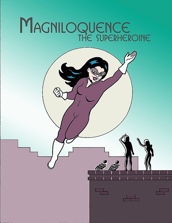 © 2013-2020. Magniloquence TM the Superheroine is written and illustrated by Robert Stradley, Characters and elements of Magniloquence are TM and © 2013-2020 Robert Stradley. All rights reserved. Graphic novels are published by Twisted Tail Productions PO box 9778 Wichita Falls, Texas, USA 76308. All names, characters, places, and events are fictitious and are meant to be treated as such. Any resemblance to actual persons past, present, or future is entirely coincidental. Any tongue-in-cheek reference to existing comics is purely intentional and readers are encouraged to ferret them out. If you cannot find any, you need to read more comics. If you can read this, you probably don't need new glasses.